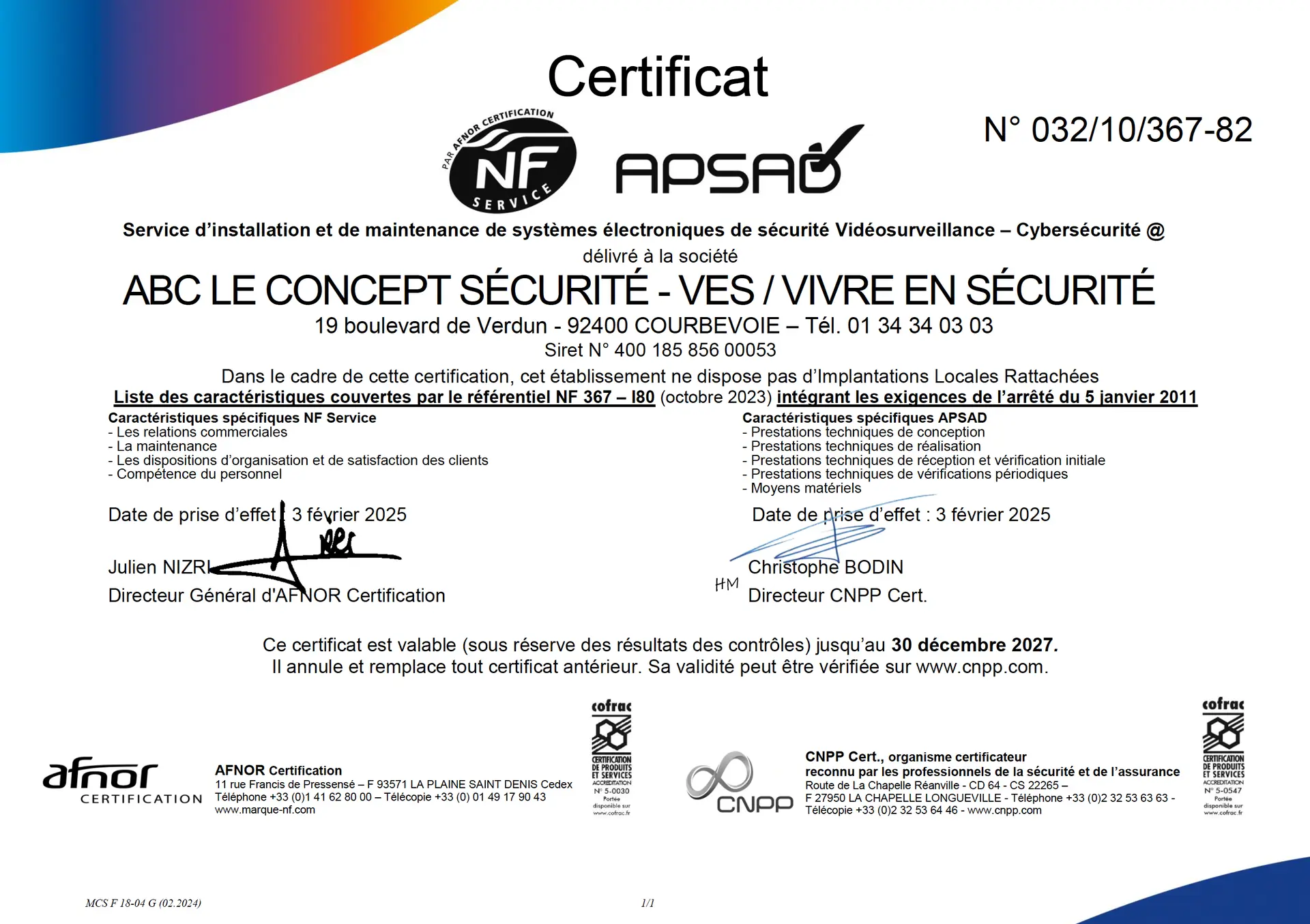 Certification APSAD R82 VIDÉO SURVEILLANCE