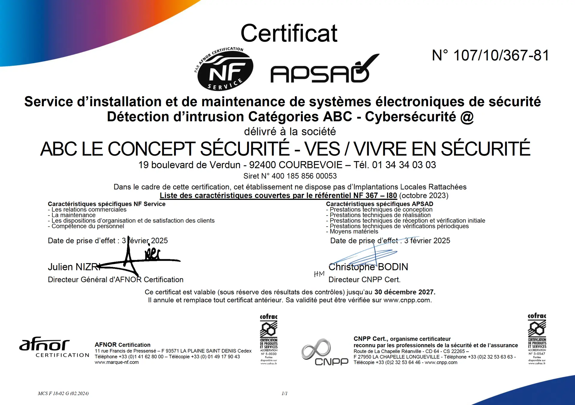 La société ABC Le Concept Sécurité est certifiée APSAD R81 ABC (Risques trés lourds)